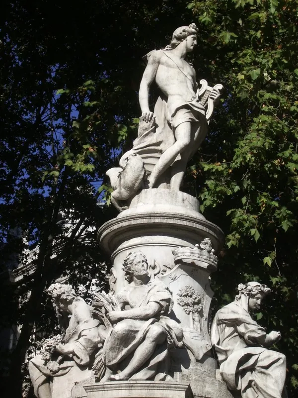 In any case, despite its poor state of conservation, this statue is considered one of the best classical works erected in Spain due to the elegance of its proportions and the capture of the divine gesture and balance. Apollo appears holding a lyre and accompanied by the allegorical sculptures of the Four Seasons — since, as god of the Sun, the birth and passage of the seasons depend on him.