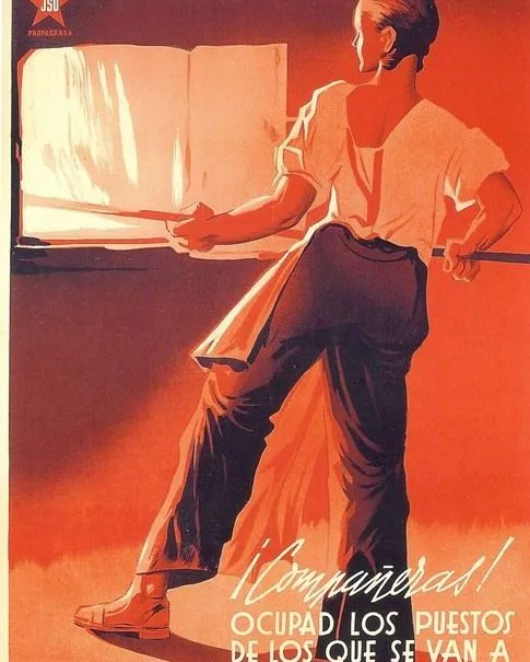 At first, the arrival of women at the front was allowed and even seemed to be encouraged through the posters generated at that moment, which weren't so much seeking female participation as appealing to the conscience of the men who hadn't enlisted. Women joining the militias, taking up the rifle and training like their male comrades was only allowed during the first months of the war — partly due to the governmental and military collapse and disorganization of the Second Republic in the early stages of the conflict, on top of the existence of paramilitary groups that took charge of organizing the war's first moments.
